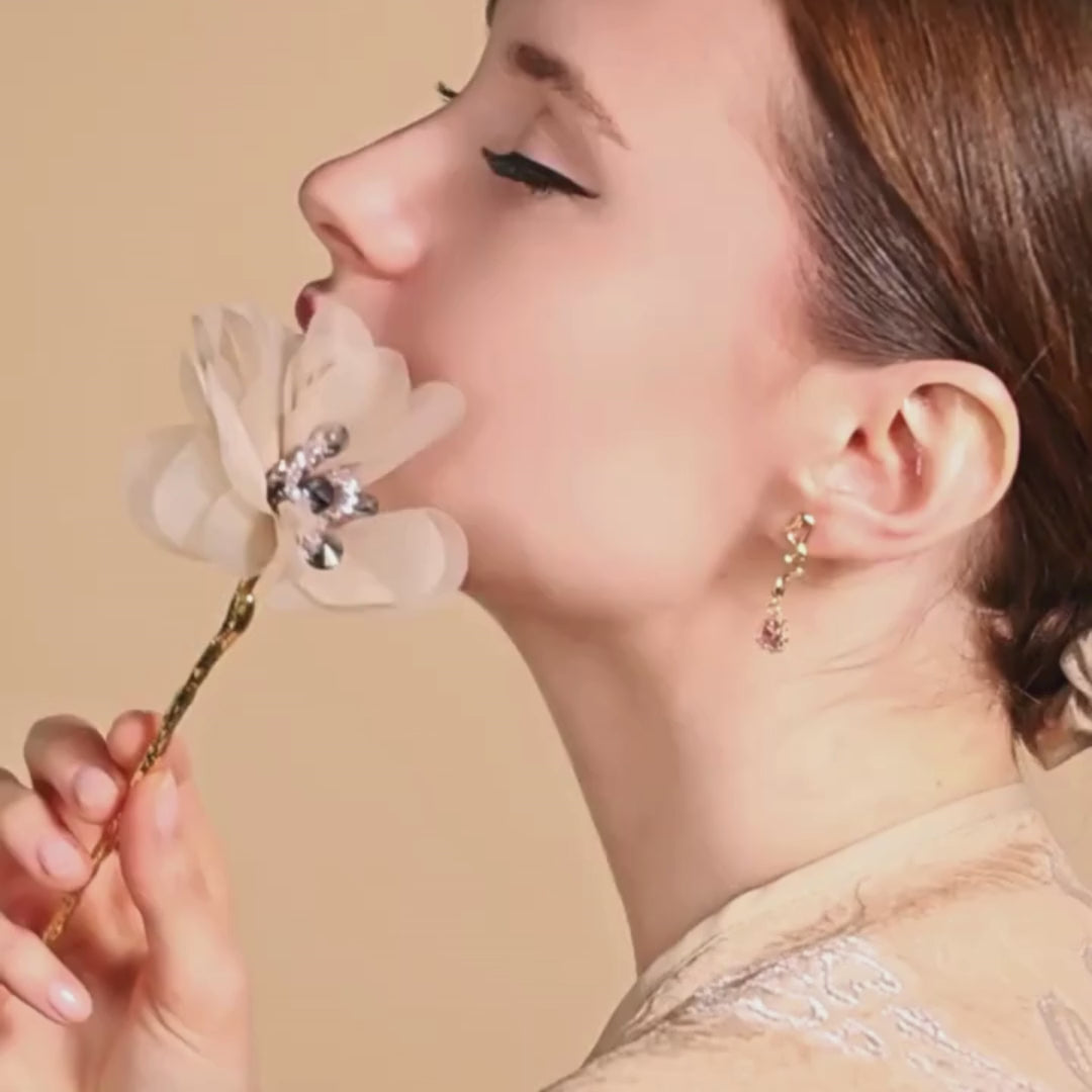 The Aurelia Bloom Hair Stick brings a soft sense of inner calm with chiffon petals and a graceful floral stem, perfect for women who express their elegance through quiet confidence and nature inspired beauty.