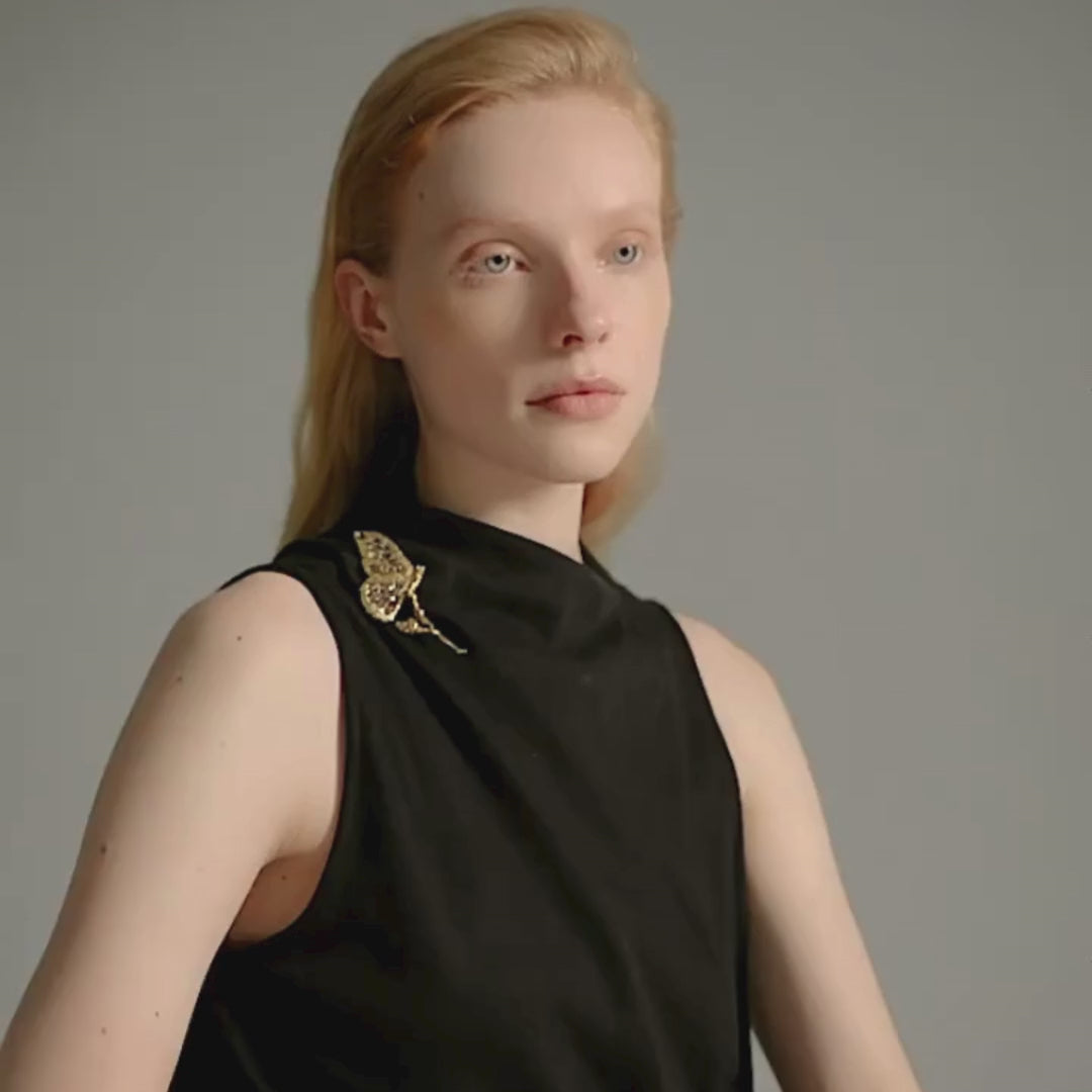 Sculpted gold butterfly on a branch, set with dark prism crystals, gives your look a nocturne glow that feels composed and rare.
