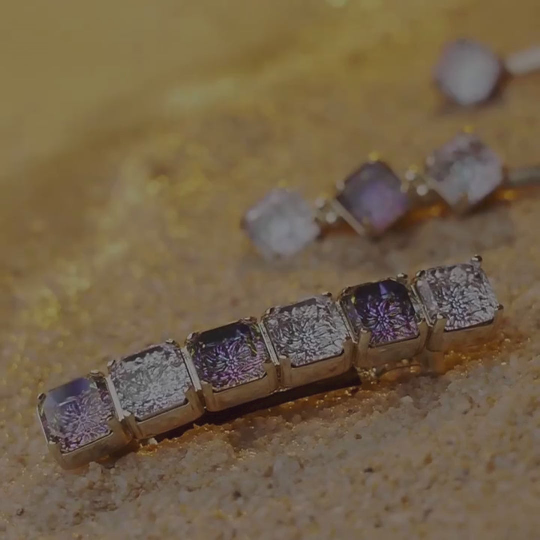Iridescent crystal tones and polished metal frame your hair in refined calm, turning simple styling into a sea-lit finish.