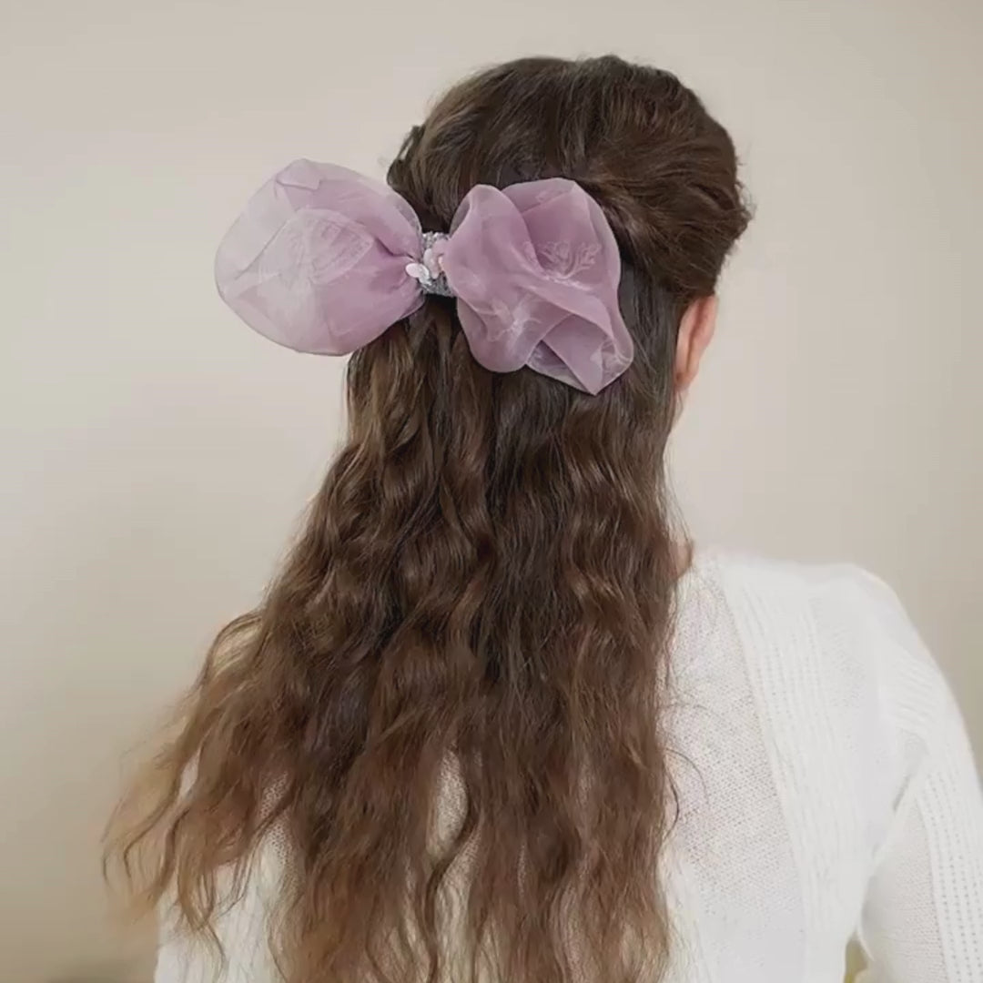Sheer printed organza and hand-set crystal florals come together in a bow that feels romantic, refined, and quietly unforgettable.